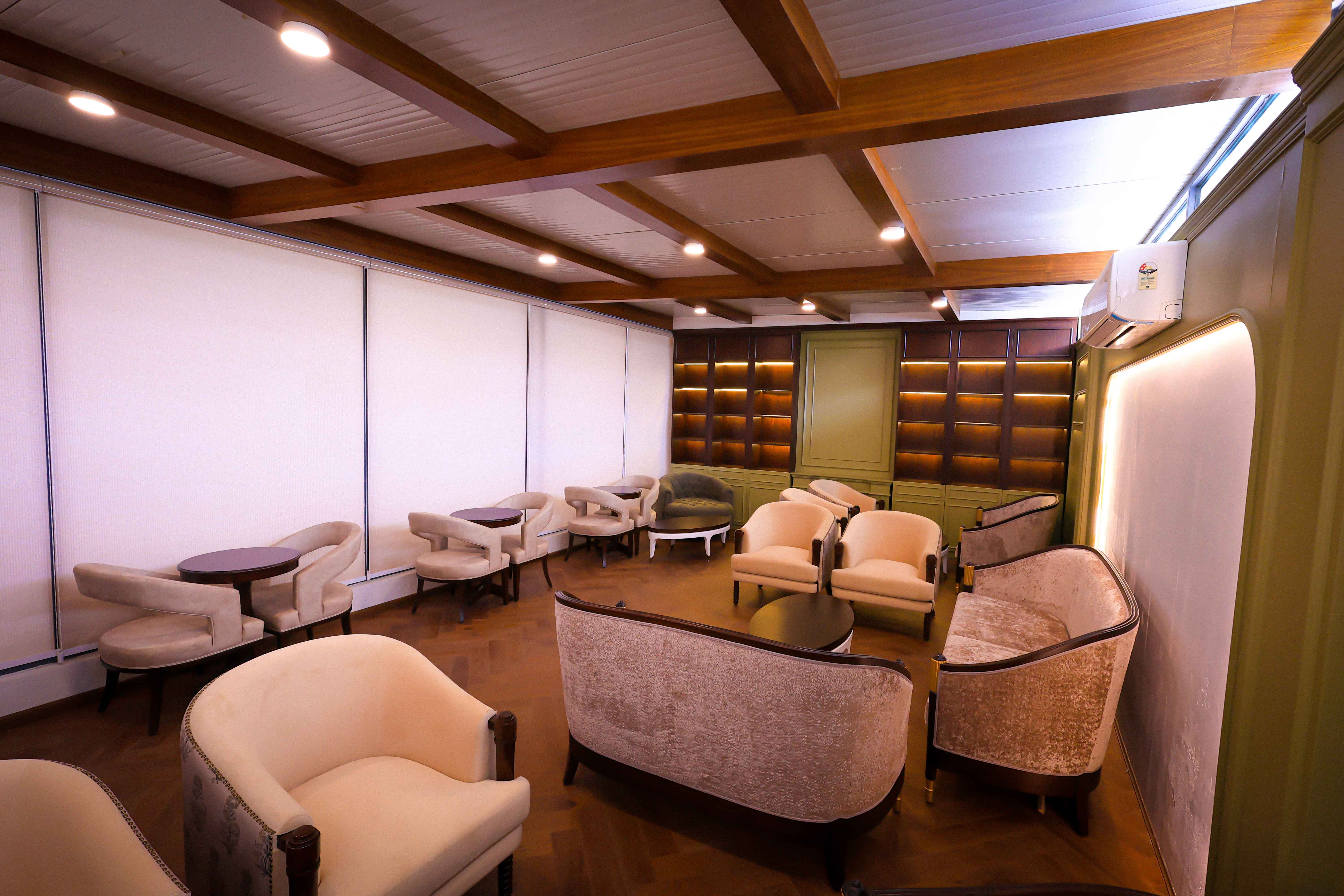 The lounge area features comfortable seating, ambient lighting, and a soothing atmosphere for quiet conversations or mindful relaxation. The library is thoughtfully curated with books on wellness, Ayurveda, mindfulness, meditation, and personal development, encouraging self-learning and mental rejuvenation.